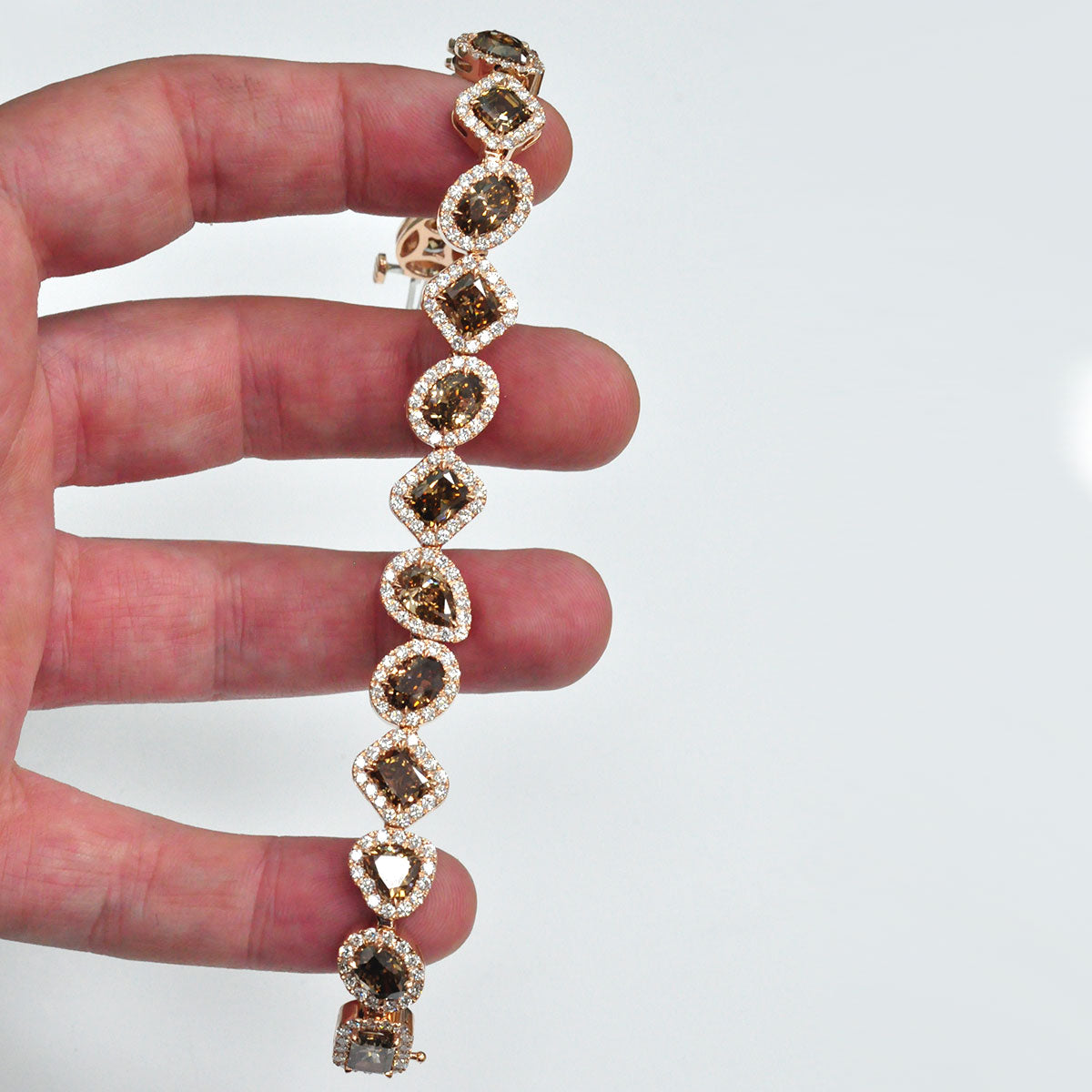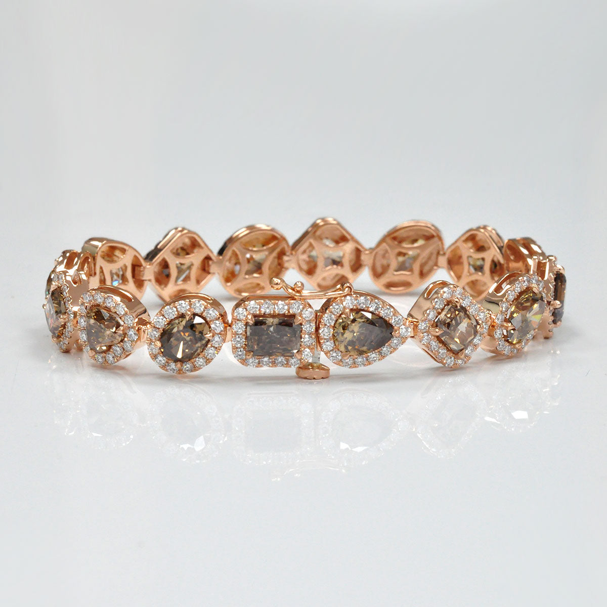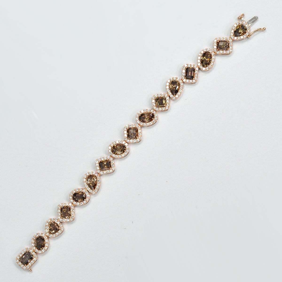 This exquisite bracelet features a stunning mix of fancy-shaped champagne diamonds, each framed by a sparkling halo of natural white diamonds. Set in warm 14K rose gold, the design blends elegance with a modern touch, creating a piece that radiates sophistication. Perfect for evening wear or as a statement of timeless luxury.