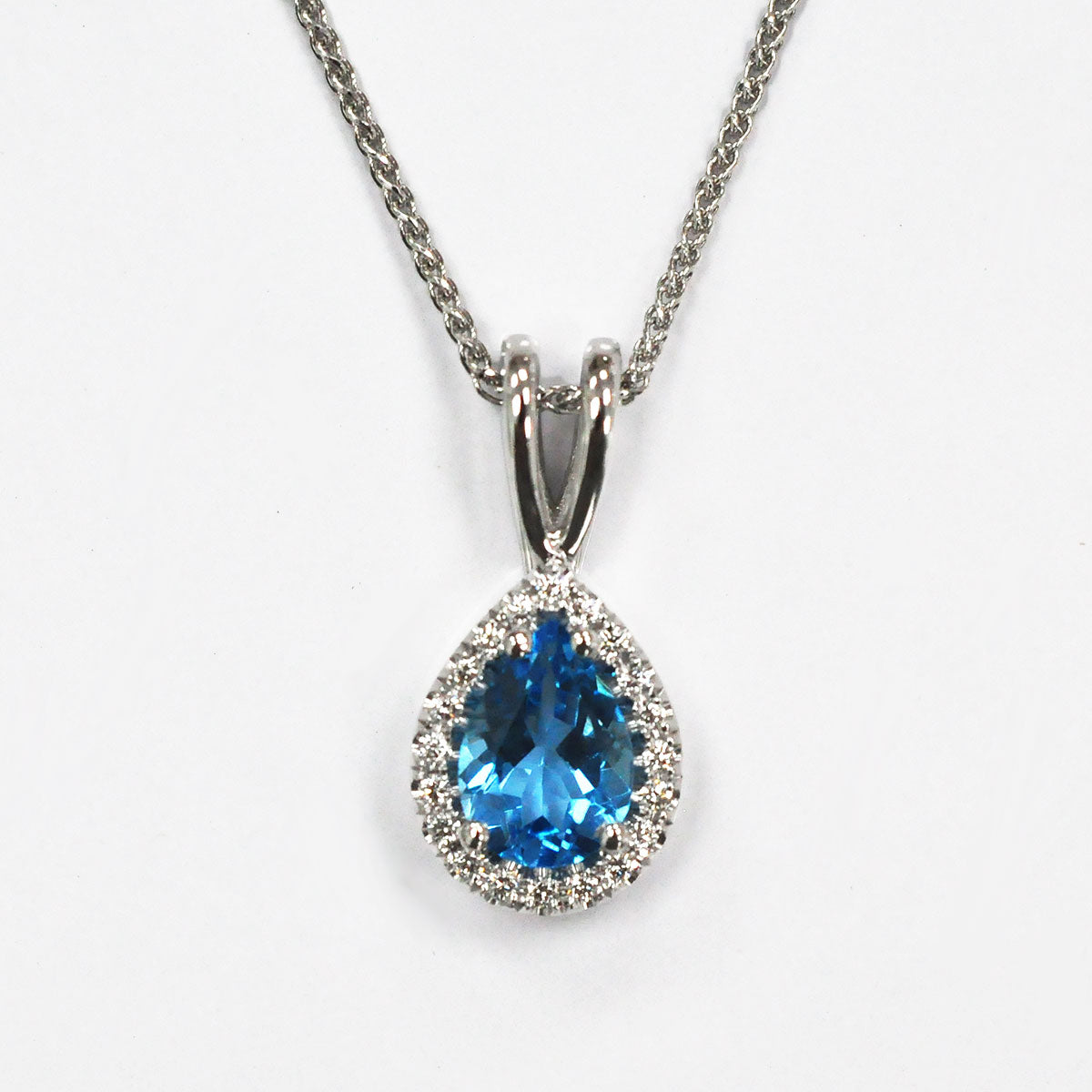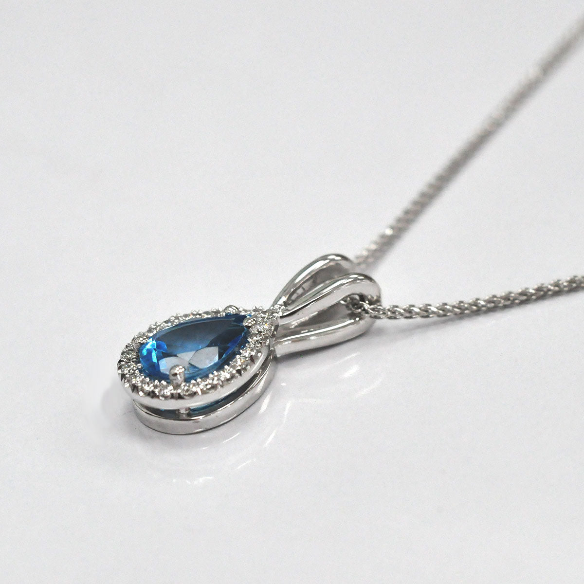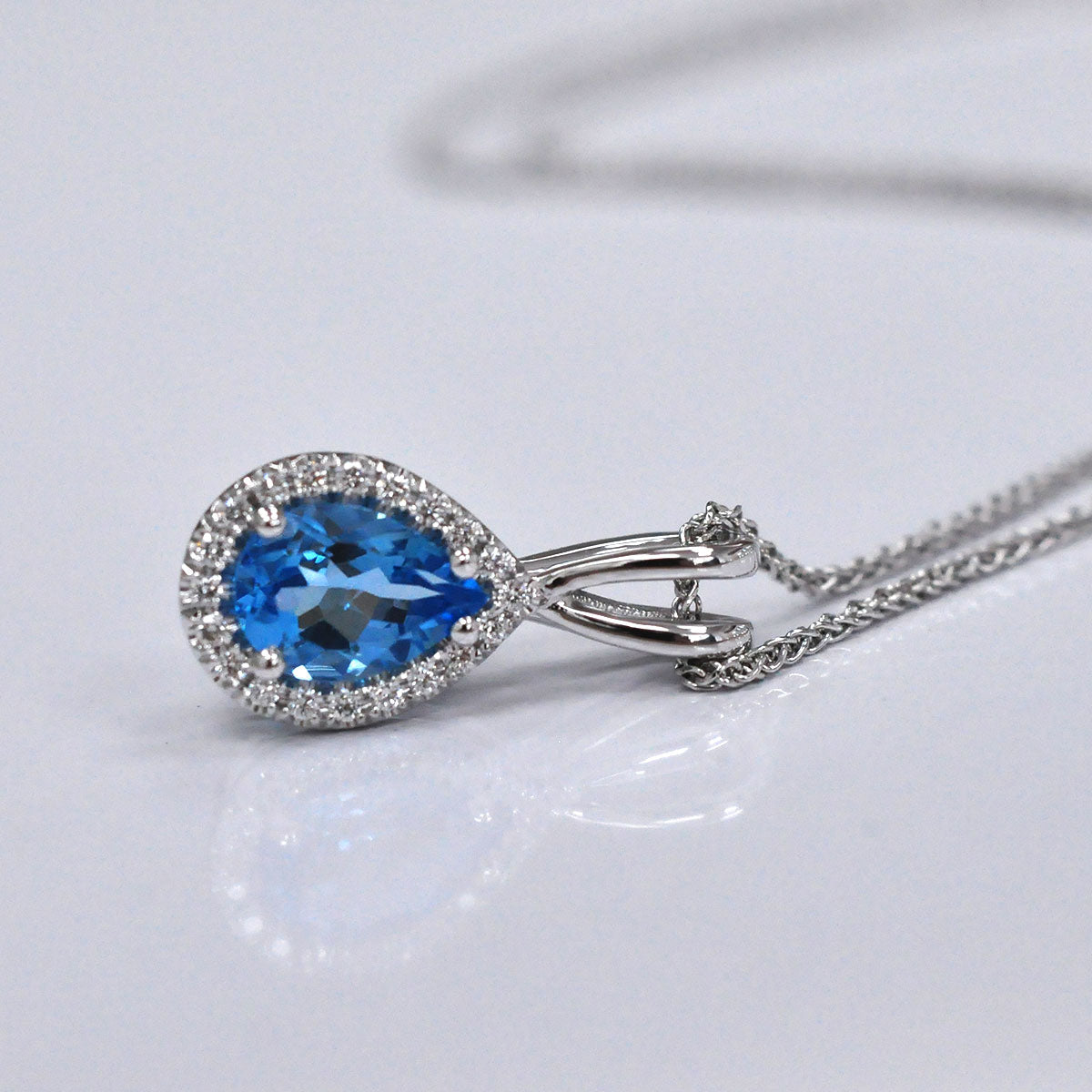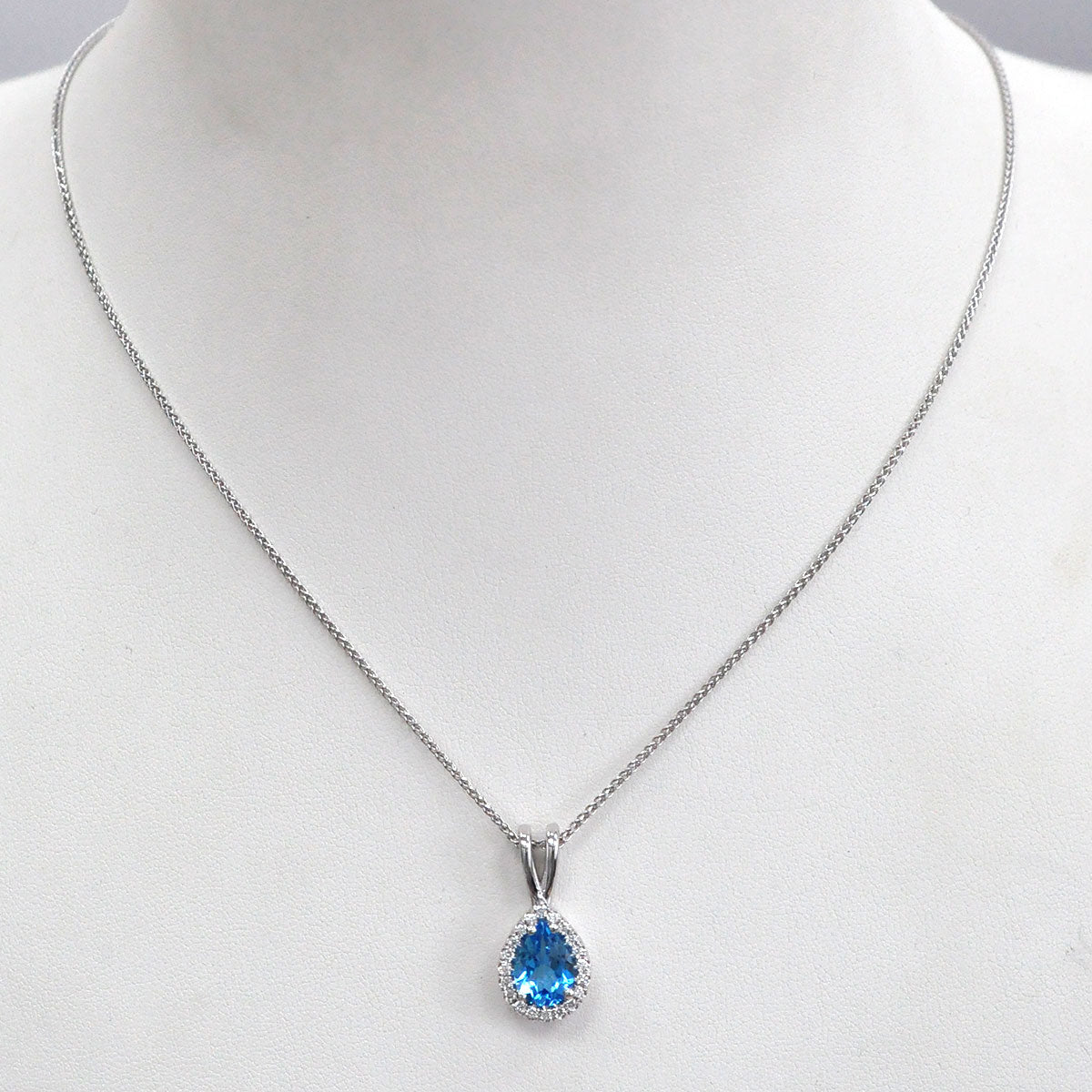 A vibrant pear-shaped blue topaz sparkles at the center of this elegant pendant, surrounded by a halo of natural diamonds for extra brilliance. Set in sleek 14K white gold, this piece adds a fresh pop of color and timeless style—perfect for everyday wear or special occasions.